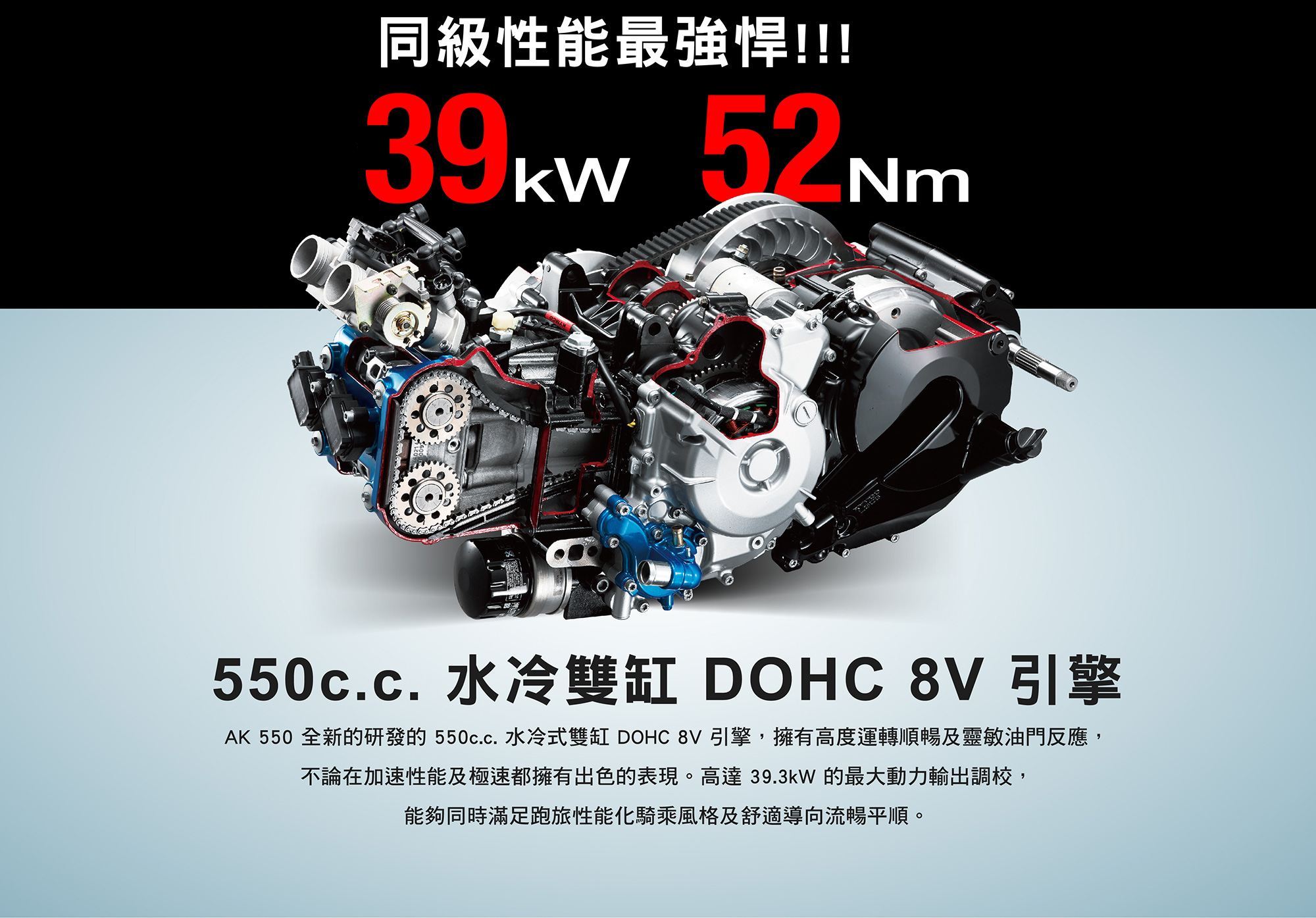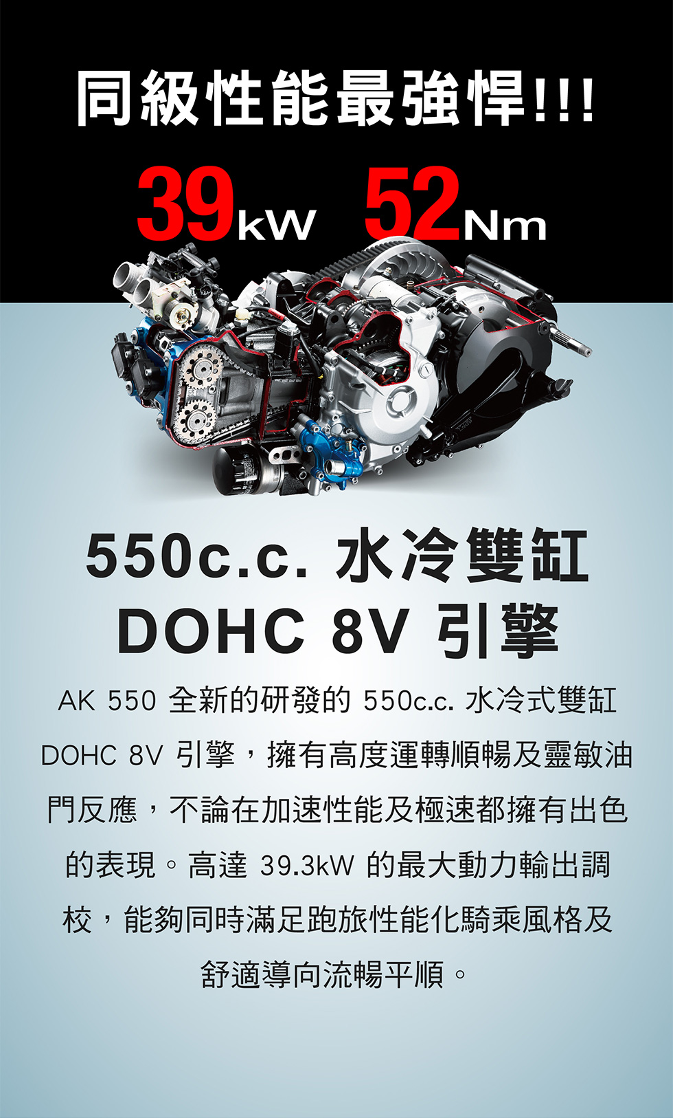 | 引擎型式 | 水冷、直列雙缸、DOHC、8V |