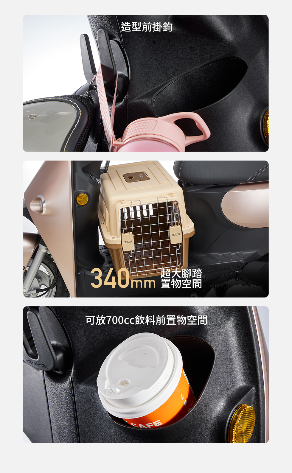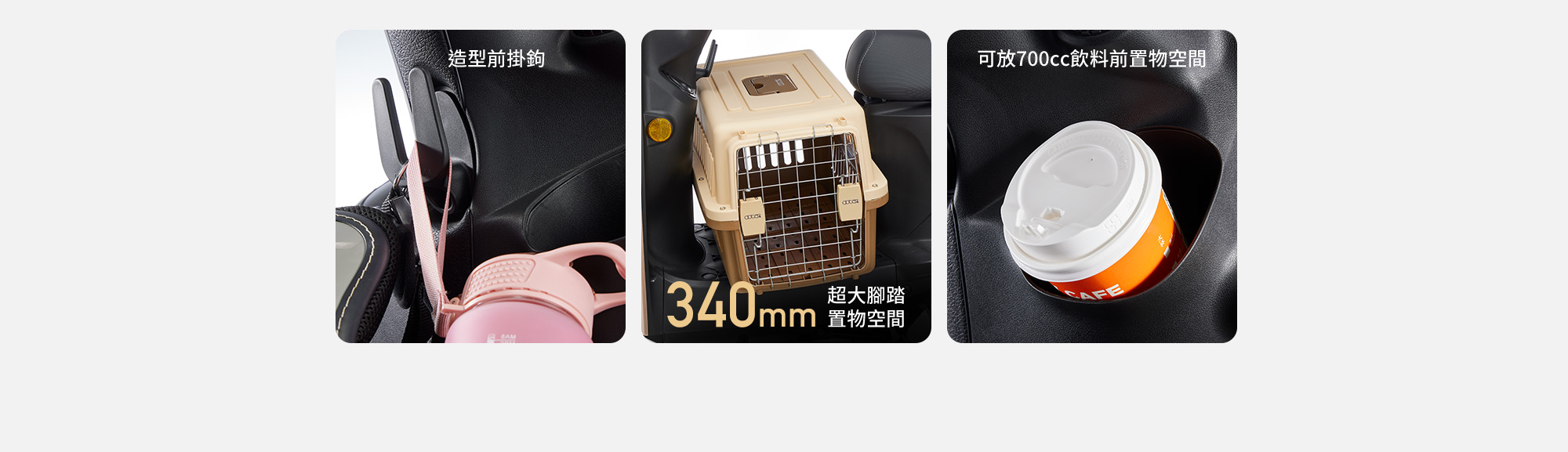 | 前置物箱空間 | 可放一杯 700 cc 飲料 |